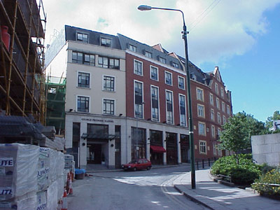 | He also made his first public speech at the Fishamble Theatre, now a modern building given over to offices, toney shops, and upscale housing. Additional new construction was in progress in 1999. |